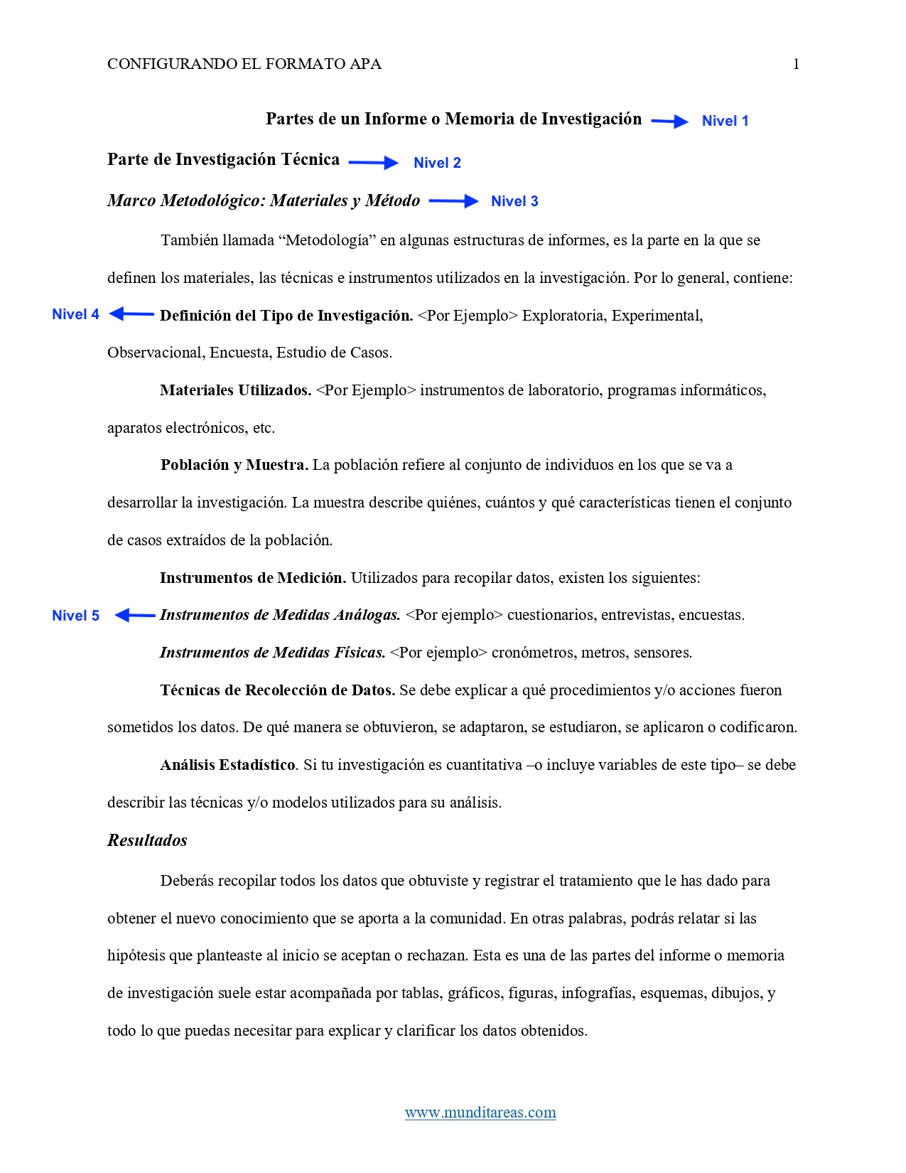 Nivel 3 | Alineado a la izquierda, con sangría ½ pulgada, con negrita, con Capitalización de tipo oración, punto final, el texto inicia en la misma línea. | Alineado a la izquierda, con negrita, con cursiva, con Capitalización de Títulos, el texto inicia en nuevo párrafo. |